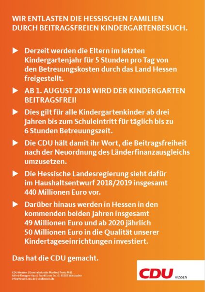 Die CDU hält damit ihr Wort, die Beitragsfreiheit nach der Neuordnung des Länderfinanzausgleichs umzusetzen. Hiermit bekennen wir uns zur solidarischen Mitverantwortung für die kommunale Aufgabe der Kinderbetreuung und zeigen einmal mehr, dass Land und Kommunen auch in diesem Bereich Hand in Hand gehen. Hessen steht damit gut da. Es ist das vierte Bundesland, das eine Beitragsfreiheit für sämtliche Kindergartenjahre vorsieht. Dies zeigt, dass die Unterstützung der Familien in Hessen der CDU am Herzen liegt – und das wollen wir mit unserer Plakatkampagne in den nächsten Tagen und Wochen selbstbewusst im ganzen Bundesland zeigen.“