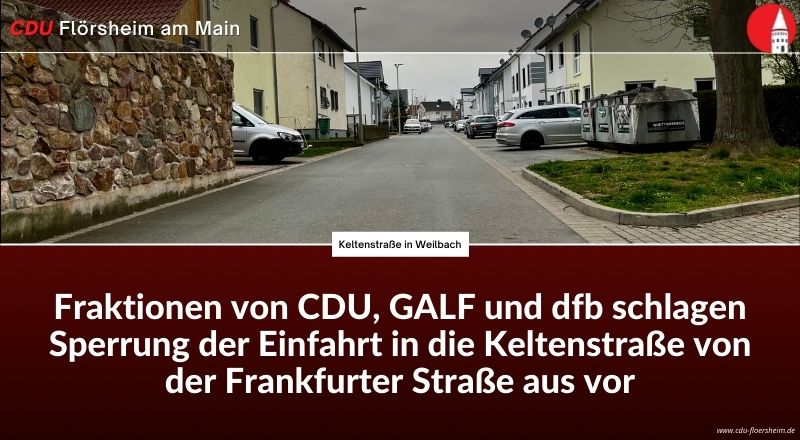 Die Fraktionen von CDU, GALF und dfb schlagen die Sperrung der Einfahrt in die Keltenstraße von der Frankfurter Straße aus für einen Zeitraum von zunächst einem Jahr vor und bitten Bürgermeister Dr. Bernd Blisch in der Weilbacher Ortsbeiratssitzung am Montag, dem 2. Mai 2022, um einen kurzen Bericht.