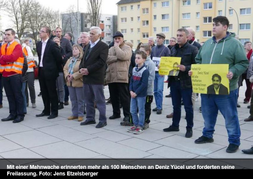 Als Gast sei auch Präsident Erdogan in der Stadt herzlich willkommen. Allerdings wisse ein Gast auch, wie er sich zu benehmen habe, so Antenbrink. Nazi-Vergleiche gehörten nicht dazu. Ilkay Yücel, die Schwester des Inhaftierten, dankte den Teilnehmern, dass ihr Bruder nicht vergessen werde. Vor einer Woche habe sie im Gefängnis eine Stunde mit ihm reden können. Die Solidarität aus seiner Heimatstadt bewege ihren Bruder besonders, sagte Ilkay Yücel. SPD-Fraktionsvorsitzende Marion Eisenmann-Kohl erinnerte daran, dass in der Türkei weltweit die meisten Journalisten inhaftiert seien.